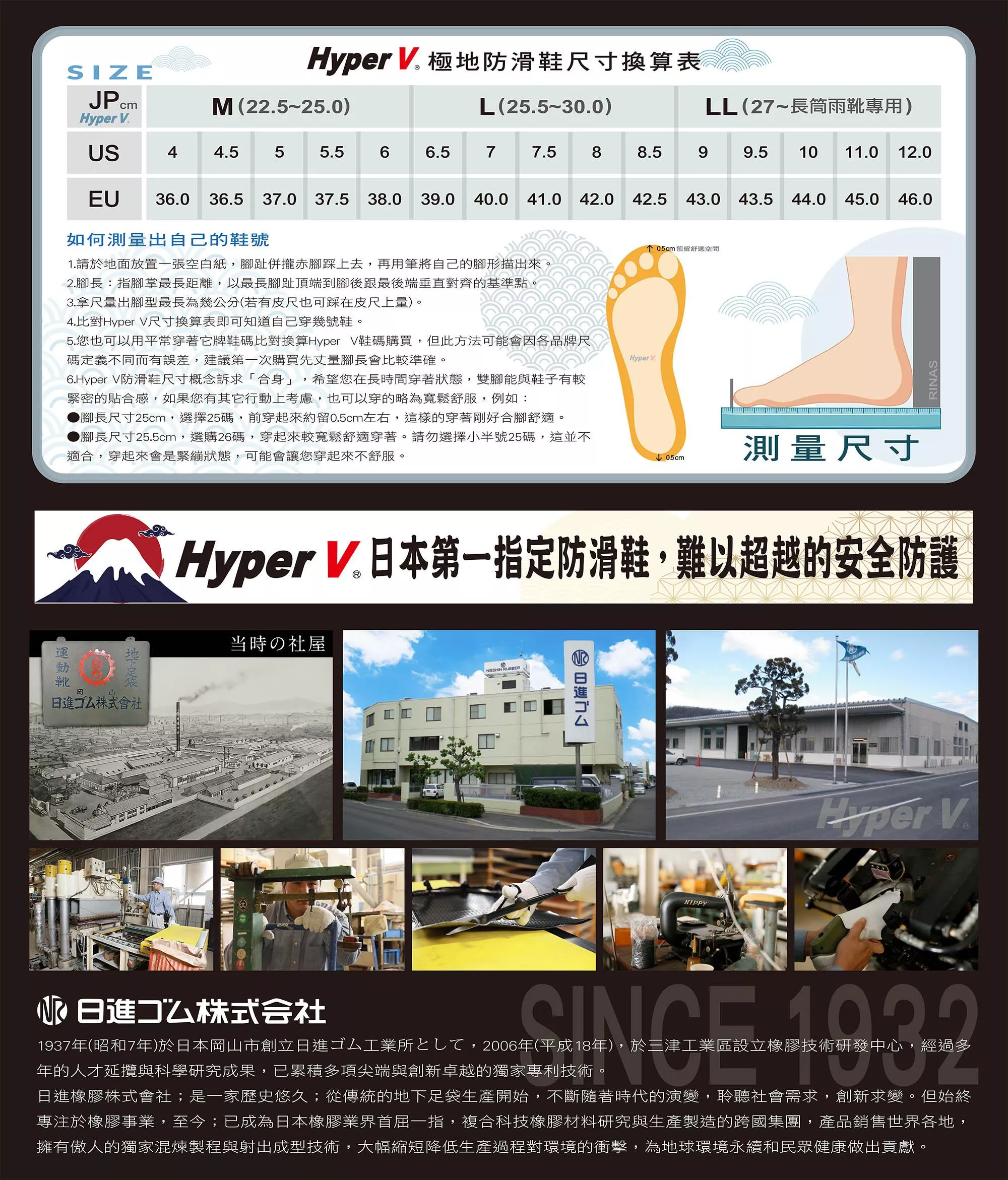 ●日進橡膠創立於1932年(昭和7年),擁有世界一流橡膠技術研發中心,累積無數橡膠製程know how,專注於橡膠複合材料研究與創新跨國集團,是日本最專業防滑鞋公司。
